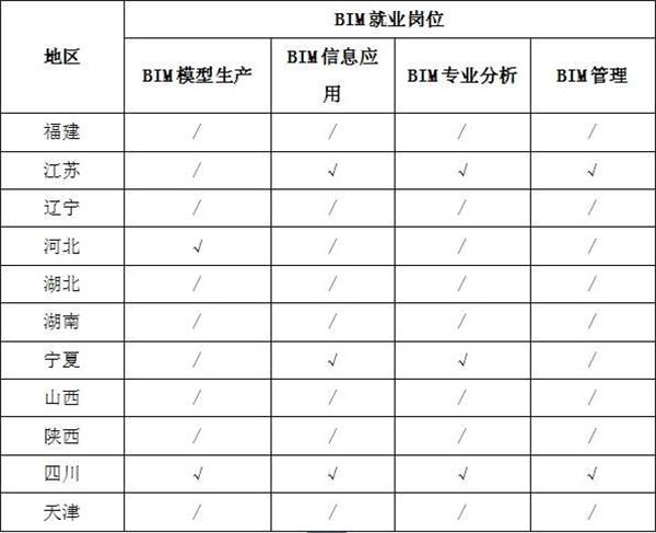 3、就業(yè)崗位分布。從11個省市的BIM就業(yè)崗位分布來看,不同地區(qū)的企業(yè)對BIM人才的崗位需求也各不相同,BIM技術應用發(fā)達的地區(qū)更需要能將BIM技術與生產過程融合的復合型人才,不局限于BIM建模工作,例如江蘇省企業(yè)招聘的人員以BIM信息應用,BIM專業(yè)分析和BIM項目管理為主。