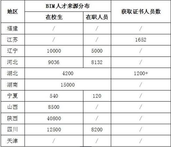 1、來源分布。11個省市提供的數據表明,BIM人才主要來源于在校學生,以及接受BIM相關培訓的企業(yè)在崗人員,詳見表所示。
